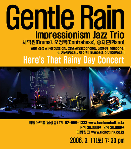 | Æ®¸®¿À Á¨Æ²·¹ÀÎ(Gentle Rain) ù °ø½Ä ÄܼƮ - 'Here's That Rainy Day Concert' 2006-02-15 01:41 | ÃÖ°í°ü¸®ÀÚ | 2008-05-05 | 1,292 |